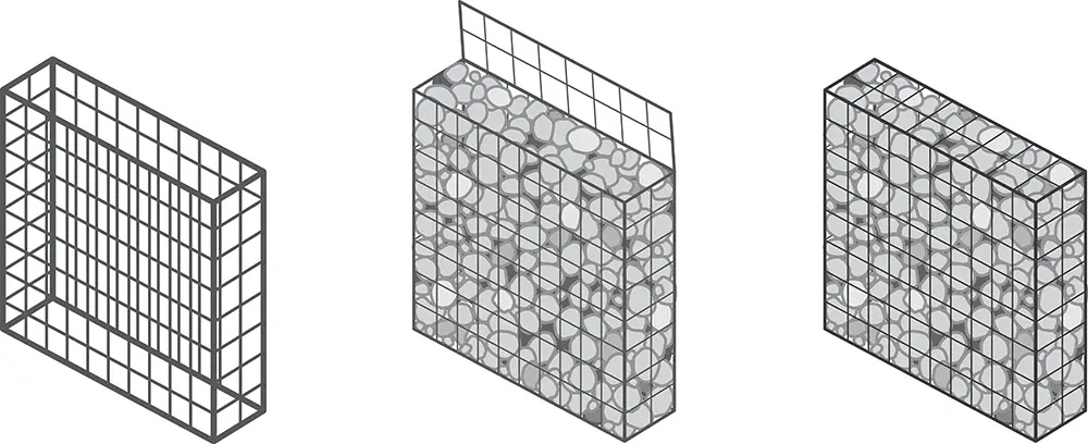 3.-Cierre del gavión: una vez que el gavión está lleno, asegura el cierre de la parte superior para mantener los materiales en su lugar. Asegúrate de que el gavión esté completamente lleno y compactado para evitar que se deforme o pierda estabilidad con el tiempo.